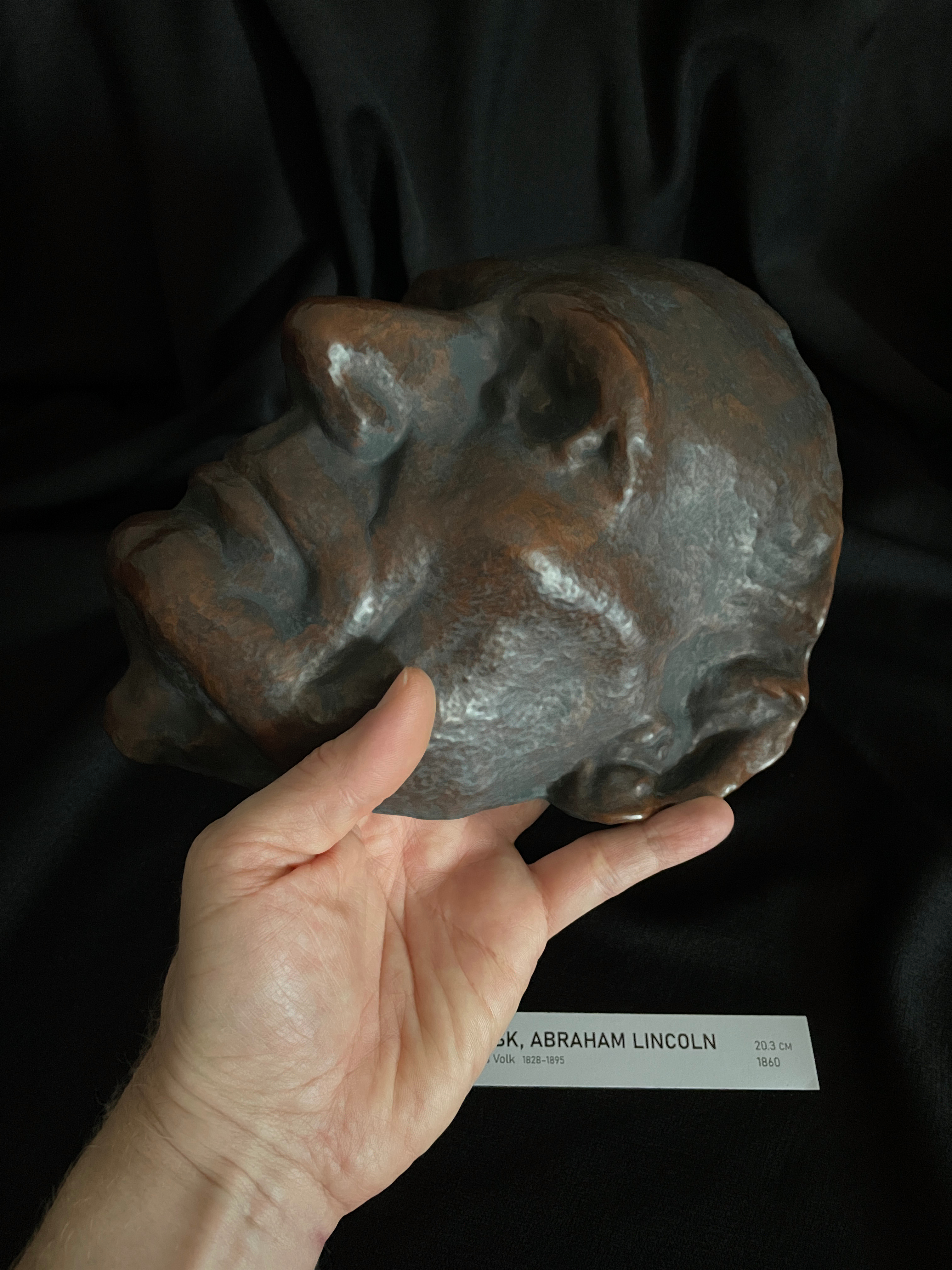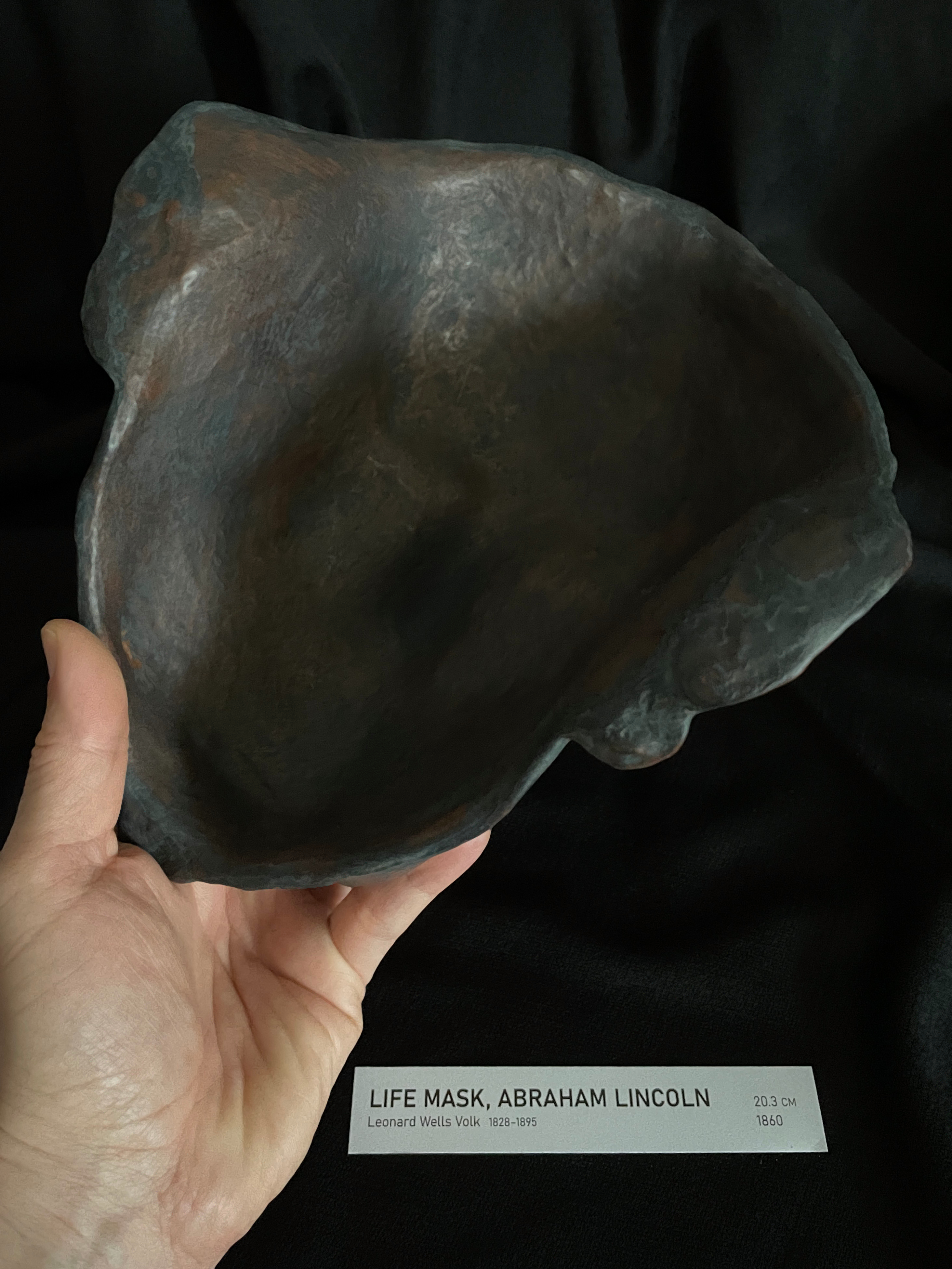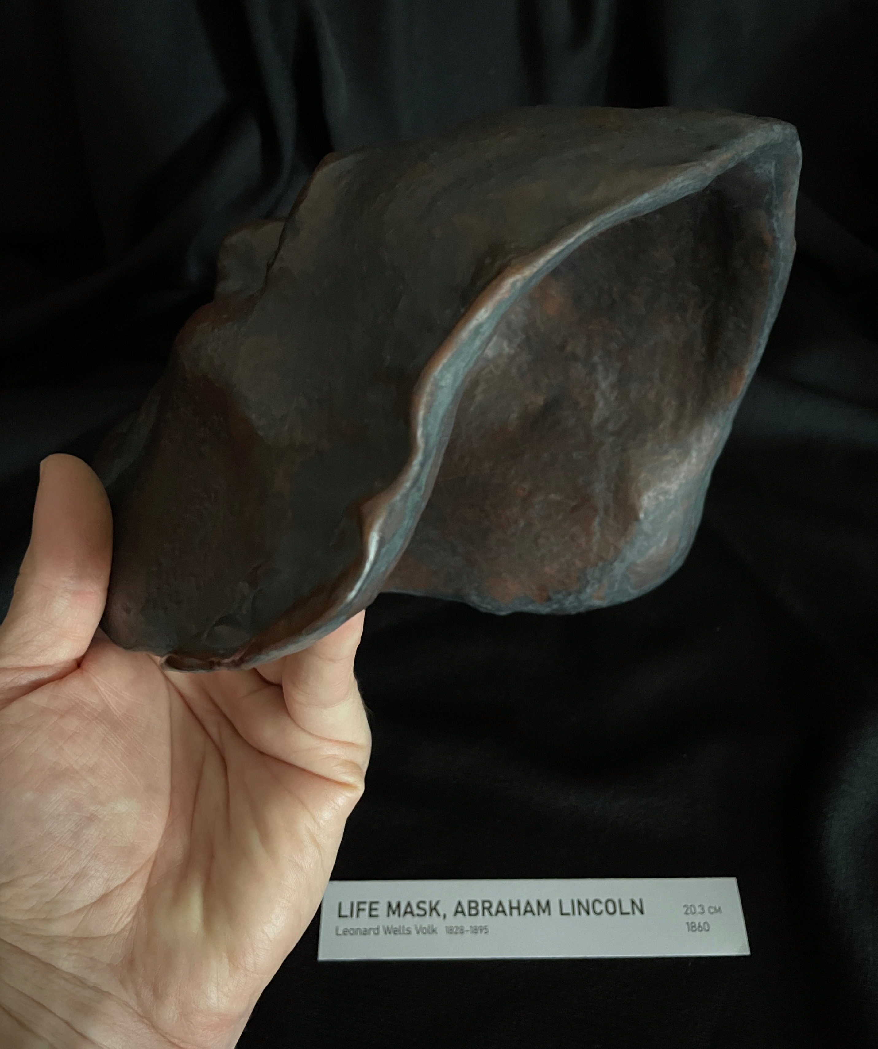 The Smithsonian original is plaster; plaster is historically correct but fragile. This 1:1 replica is built to preserve fine detail—including Lincoln’s distinctive skin marks—while improving significantly on plaster’s shatter risk. It uses an extremely hard museum wax over a second wax, over a hand-shaped latticed thermoplastic core (in that order). The internal lattice prevents flex and supports handling and close inspection.
